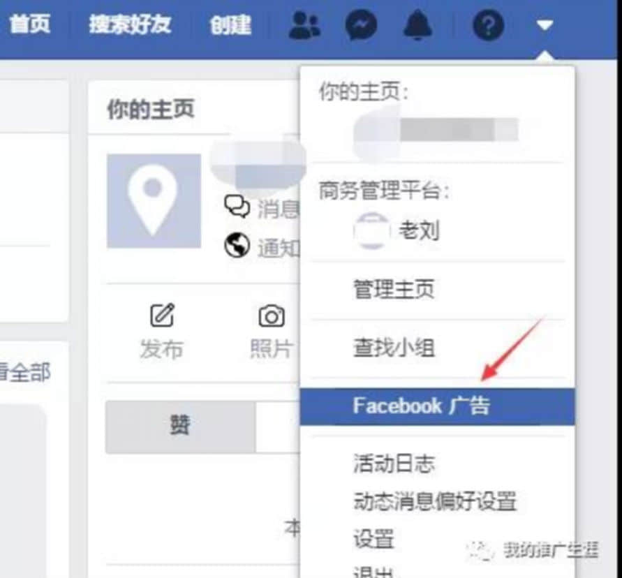 這個相對而言就會簡單很多,直接登入你的facebook賬號,點擊右上角的箭頭,可以看到“Facebook廣告”,點擊進入,就可以直接投放廣告了。
